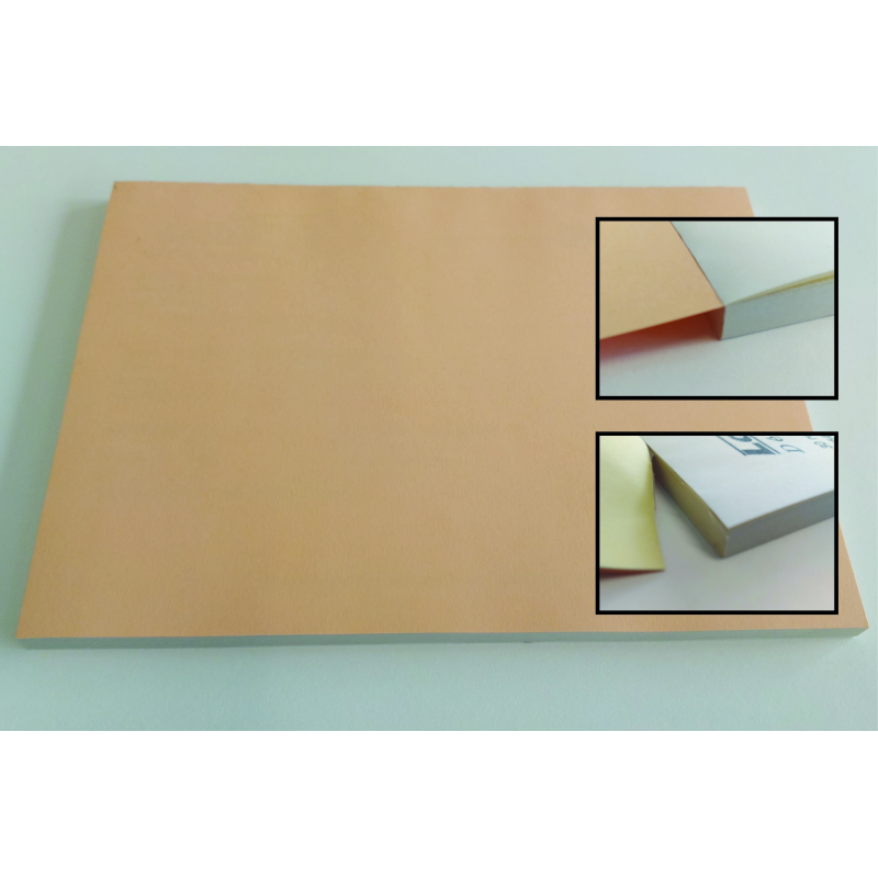 Format: 29.7x42cm. Blocs collés par 50 liasses. Pas de prédécoupe ni souche, les feuilles se détachent une par une du bloc. Impression offset monocouleur au choix. Premier feuillet CB blanc 60gr/m² obligatoire. Couverture du dessus en dossier couleur 160gr/m² et dessous carton gris 700gr/m².